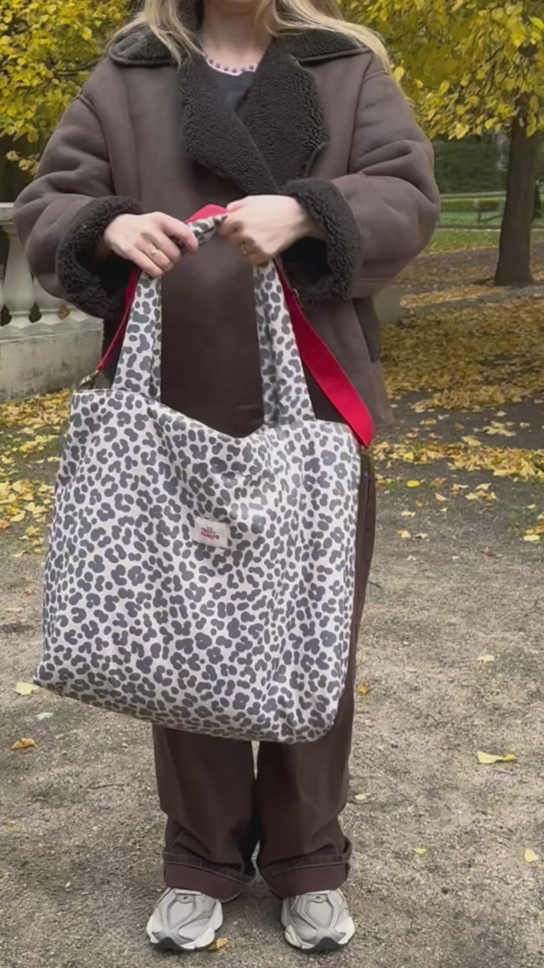 Duża, pojemna torba na ramię z nylonu z recyklingu w ponadczasowy print w plamki - praktyczna i przyjazna środowisku. Jest lekka, trwała i łatwa w czyszczeniu. Sprawdzi się w codziennym użyciu - zarówno jako torba dla mamy do wózka, na zakupy, w podróży, jak i na co dzień. Jest wodoodporna, co świetnie sprawdzi się w okresie jesienno-zimowym.