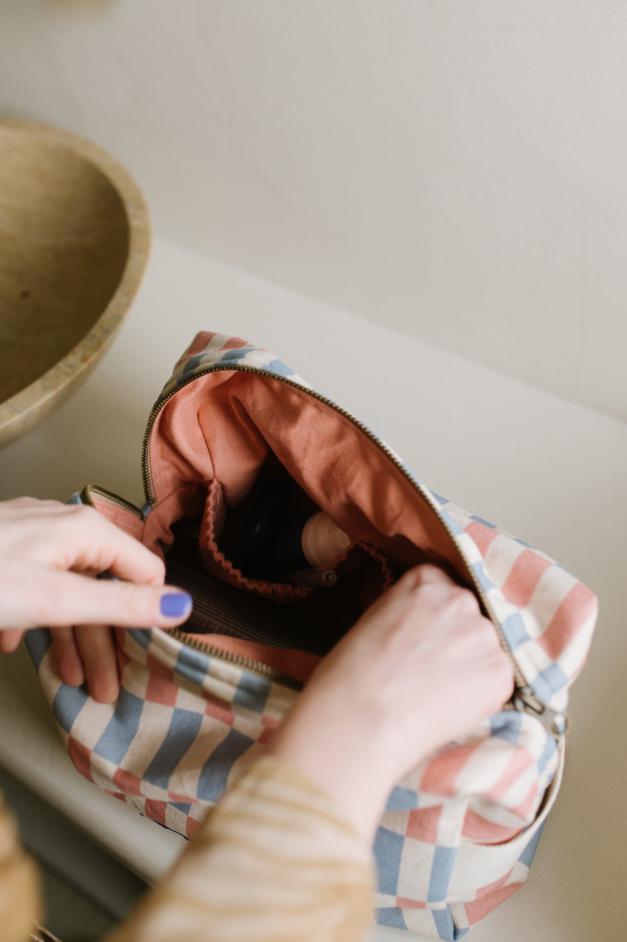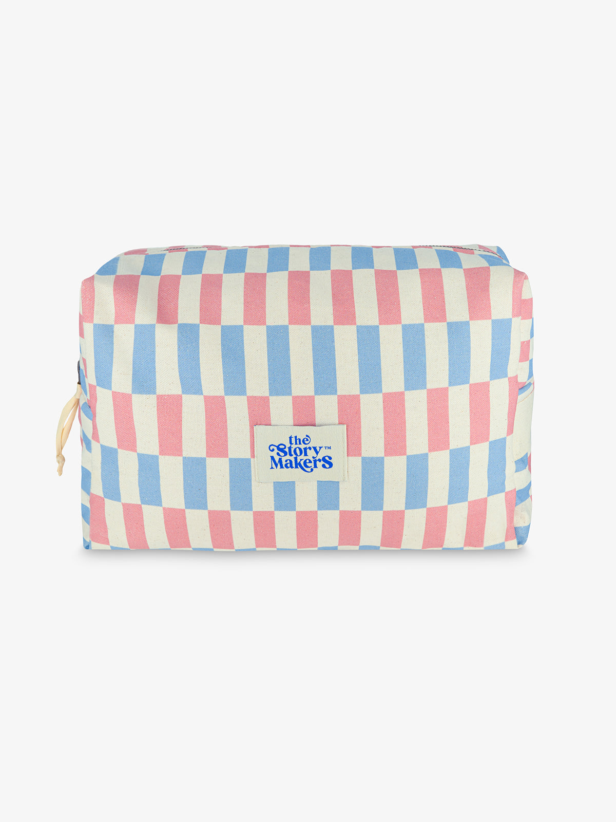 Miękka, maksymalnie pojemna bawełniana kosmetyczka z kontrastową podszewką z właściwościami wodoodpornymi. W środku dwie kieszonki na gumce dla lepszej organizacji, na zewnątrz bawełniana rączka oraz solidny, metalowy zamek.