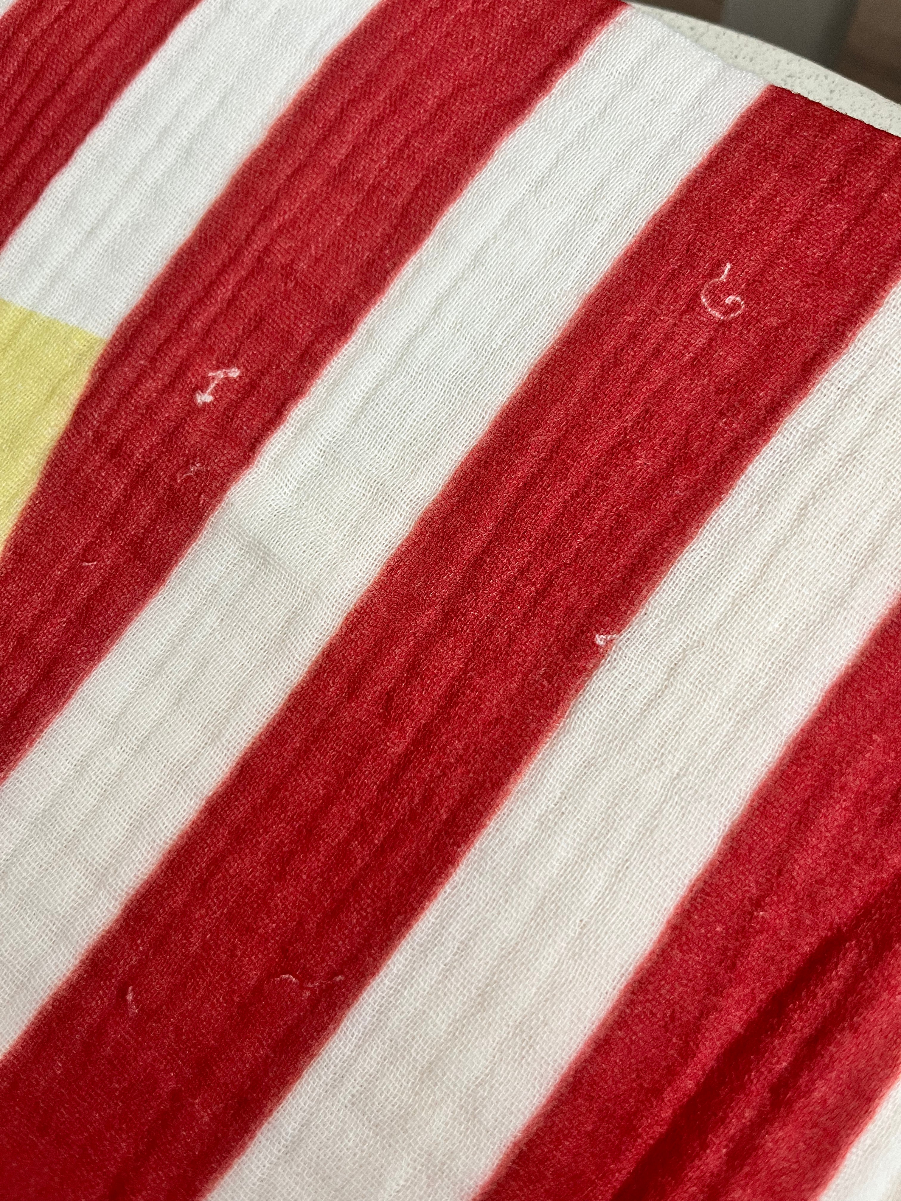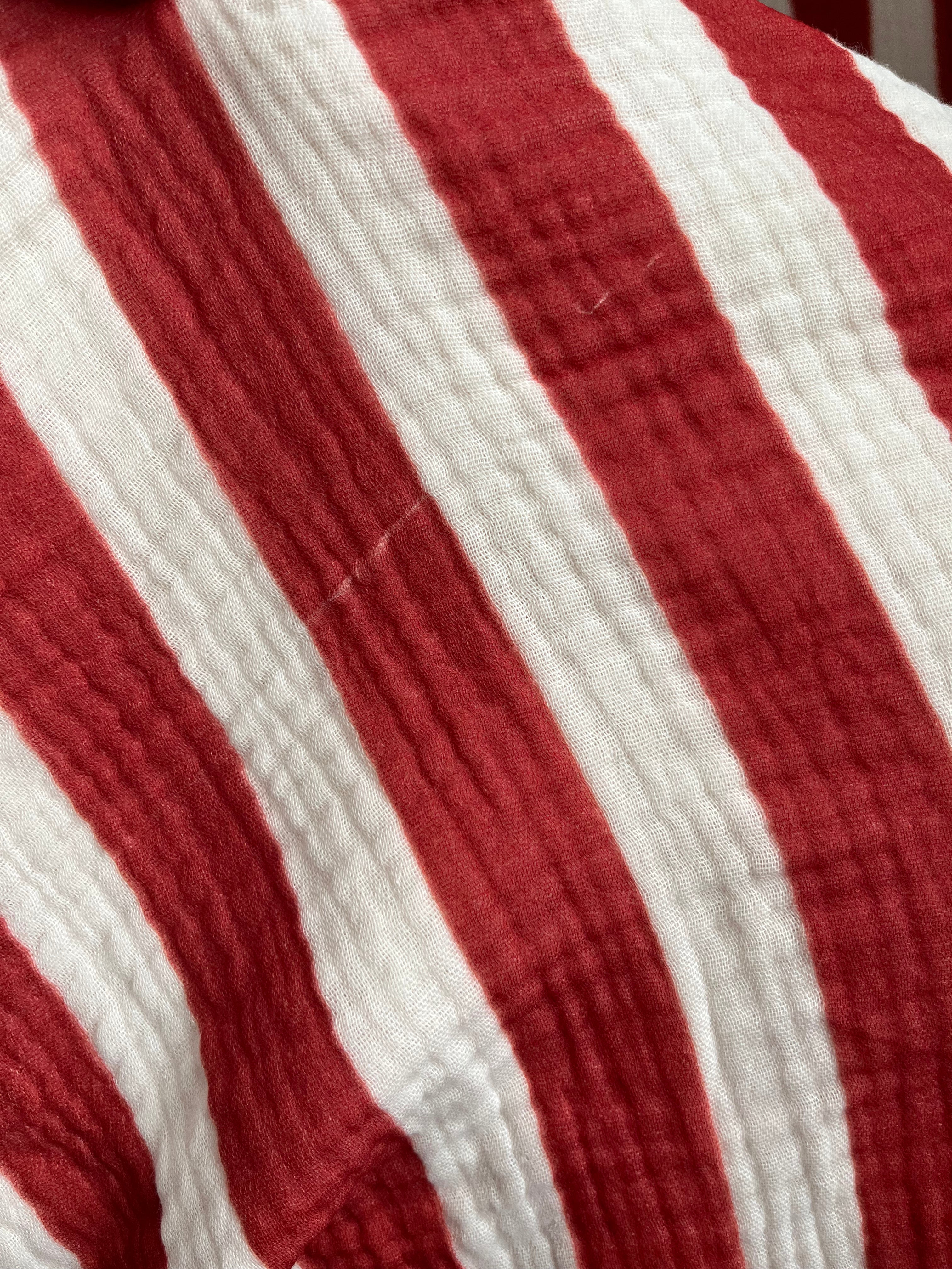 Otulacz z grubszego muślinu organicznego w czerwone pasy z napisami LOVE. Produkty mają niewielkie wady produkcyjne wpływające na estetykę, nie funkcjonalność np. przekrzywione logo, drobne powierzchnie niezadrukowane.